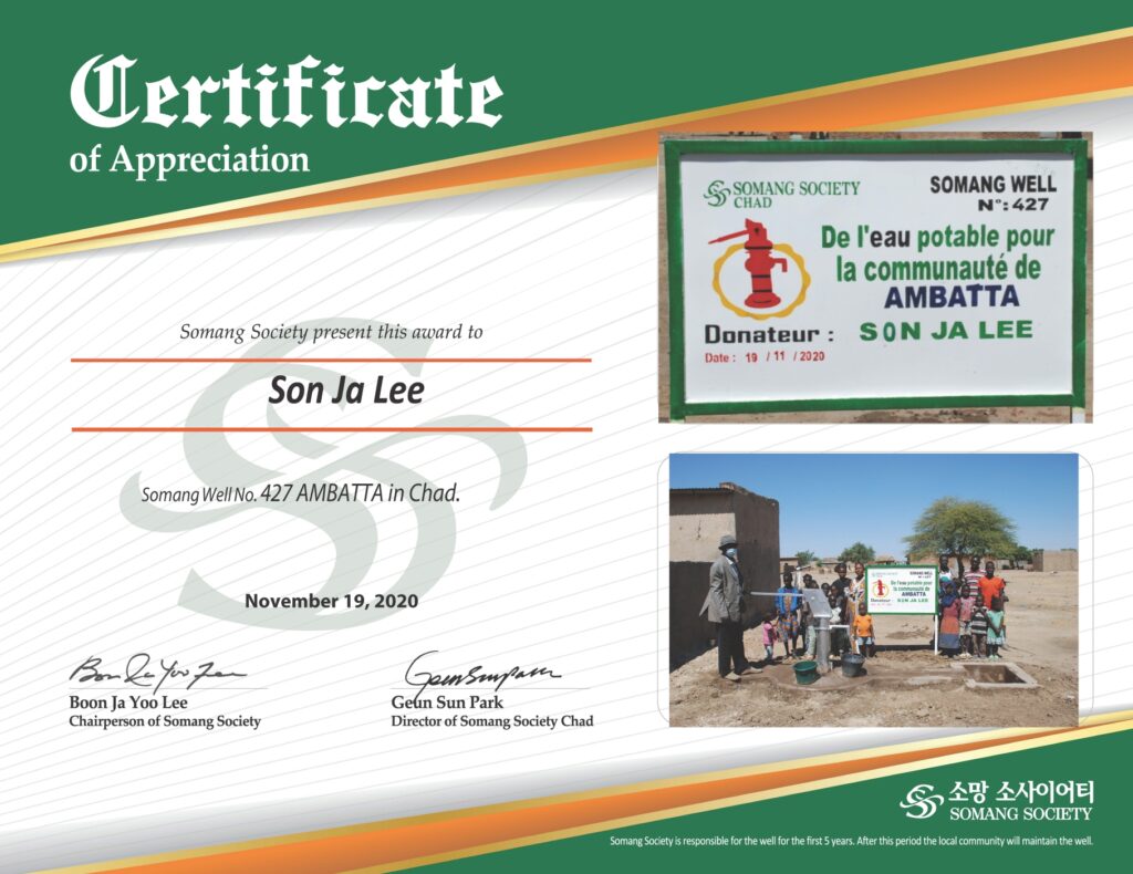 유난히 물이 부족한 아프리카 차드에 우물 1개를 만드는 비용은 3,500달러로 5년간의 관리 및 보수비용이 포함되어 있으며 약 4,000명의 인근 마을 주민들에게 깨끗한 식수를 공급함으로 그들의 목마름을 해결해 줄 뿐 아니라 8초마다 어린아이가 죽어가고 있는 아프리카의 생명을 살리고 삶의 소망을 주고 있습니다.