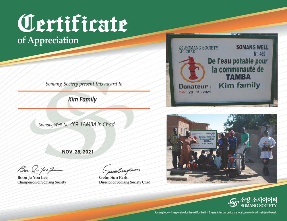 유난히 물이 부족한 아프리카 차드에 우물 1개를 만드는 비용은 3,500달러로 5년간의 관리 및 보수비용이 포함되어 있으며 약 4,000명의 인근 마을 주민들에게 깨끗한 식수를 공급함으로 그들의 목마름을 해결해 줄 뿐 아니라 8초마다 어린아이가 죽어가고 있는 아프리카의 생명을 살리고 삶의 소망을 주고 있습니다.
