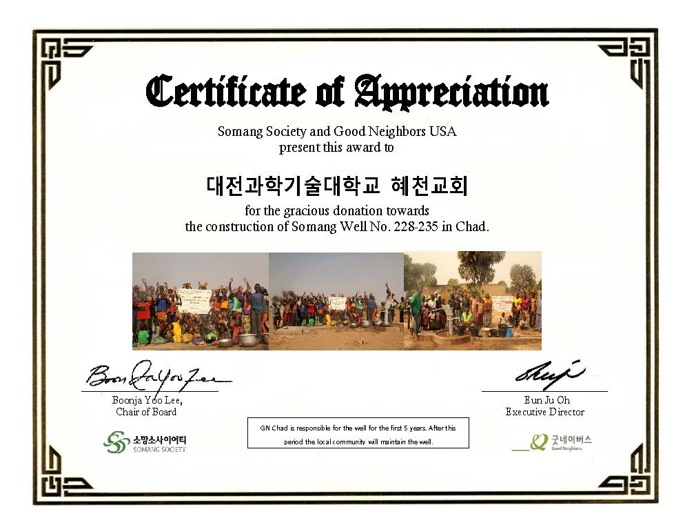 유난히 물이 부족한 아프리카 차드에 우물 1개를 만드는 비용은 3,500달러로 5년간의 관리 및 보수비용이 포함되어 있으며 약 4,000명의 인근 마을 주민들에게 깨끗한 식수를 공급함으로 그들의 목마름을 해결해 줄 뿐 아니라 8초마다 어린아이가 죽어가고 있는 아프리카의 생명을 살리고 삶의 소망을 주고 있습니다.