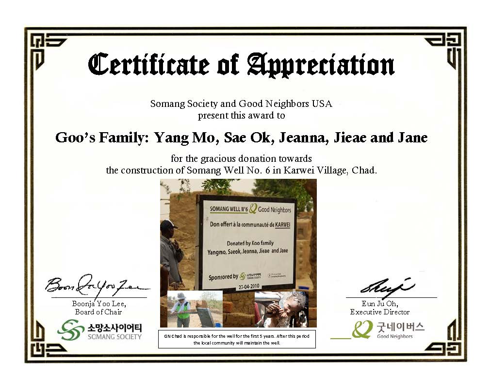 유난히 물이 부족한 아프리카 차드에 우물 1개를 만드는 비용은 3,500달러로 5년간의 관리 및 보수비용이 포함되어 있으며 약 4,000명의 인근 마을 주민들에게 깨끗한 식수를 공급함으로 그들의 목마름을 해결해 줄 뿐 아니라 8초마다 어린아이가 죽어가고 있는 아프리카의 생명을 살리고 삶의 소망을 주고 있습니다.